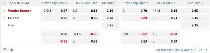 Tip kèo Châu Á hiệp 1 Werder Bremen vs Koln