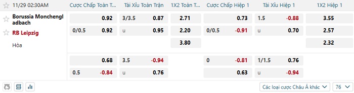 - Dự đoán tỷ số hiệp 1: Monchengladbach 0 – 0 Leipzig