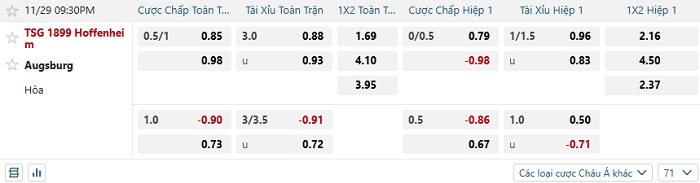 Tip kèo Châu Á full trận Hoffenheim vs Augsburg