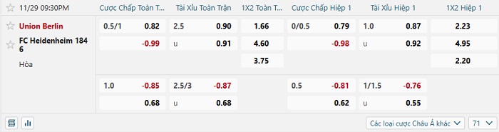 Tip kèo Châu Á hiệp 1 Union Berlin vs Heidenheim