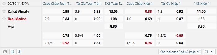 Tip kèo Châu Á hiệp 1 Kairat Almaty vs Real Madrid