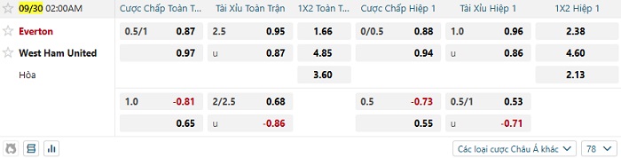 Tip kèo Châu Á hiệp 1 Everton vs West Ham
