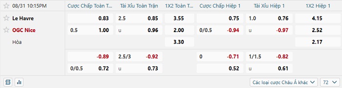 Tip kèo Châu Á full trận Havre vs Nice