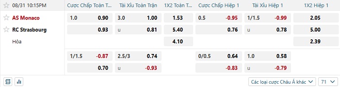 Tip kèo Châu Á hiệp 1 Monaco vs Strasbourg