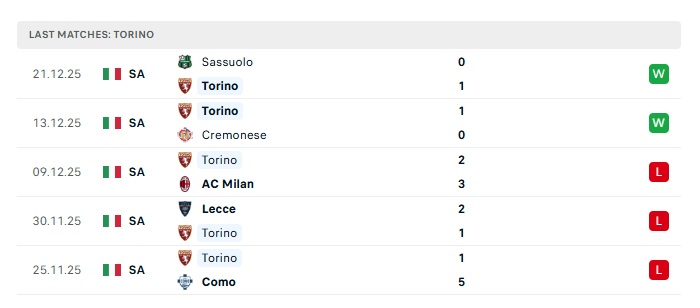 - Phong độ gần đây Torino