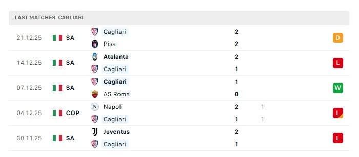 - Phong độ gần đây Cagliari