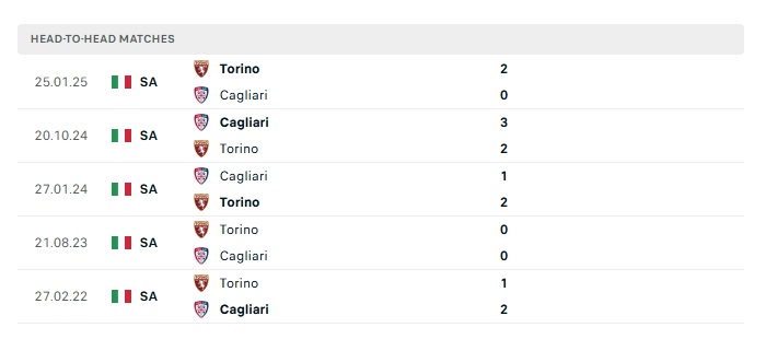 Lịch sử đối đầu Torino vs Cagliari
