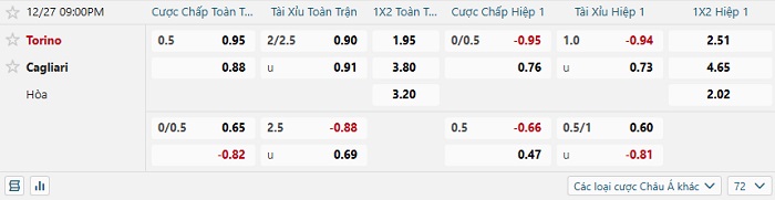 Bảng tỷ lệ kèo bóng đá hôm nay Torino vs Cagliari