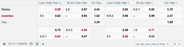 Bảng tỷ lệ kèo bóng đá Torino vs Juventus