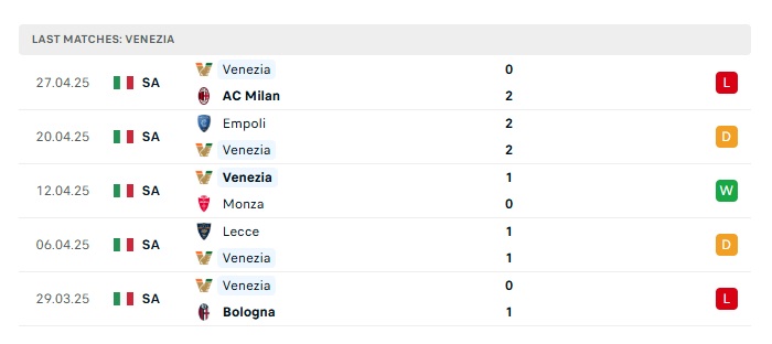 - Phong độ gần đây Venezia