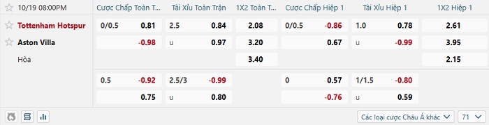Bảng tỷ lệ kèo bóng đá Tottenham vs Aston Villa