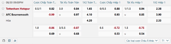 Bảng tỷ lệ kèo bóng đá Tottenham vs Bournemouth