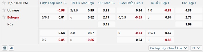 Bảng tỷ lệ kèo nhà cái Udinese vs Bologna