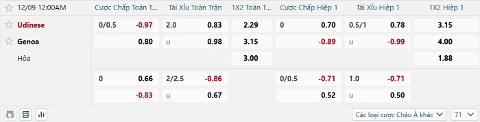 Bảng tỷ lệ kèo bóng đá hôm nay Udinese vs Genoa