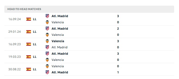 Lịch sử đối đầu Valencia vs Atletico Madrid