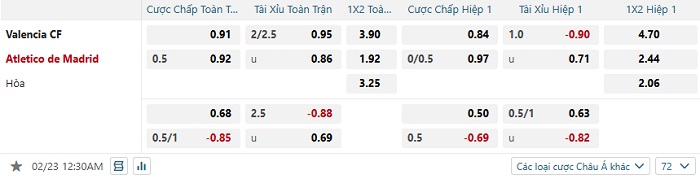 Bảng tỷ lệ kèo bóng đá Valencia vs Atletico Madrid
