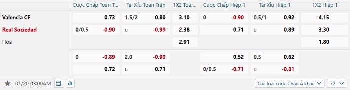 Bảng tỷ lệ kèo bóng đá Valencia vs Real Sociedad