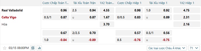 Bảng tỷ lệ kèo bóng đá Valladolid vs Celta Vigo