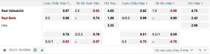 Bảng tỷ lệ kèo bóng đá Valladolid vs Real Betis