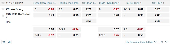 Bảng kèo bóng đá Wolfsburg vs Hoffenheim