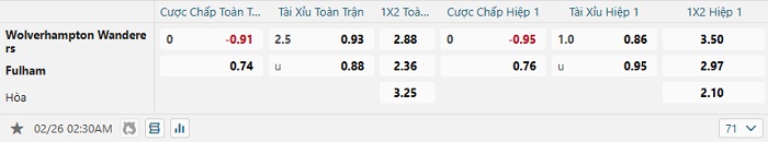 Bảng tỷ lệ kèo bóng đá Wolves vs Fulham