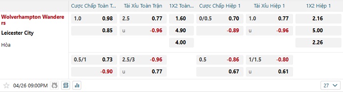 - Kèo tỷ số H1 Wolves vs Leicester City: 1-0